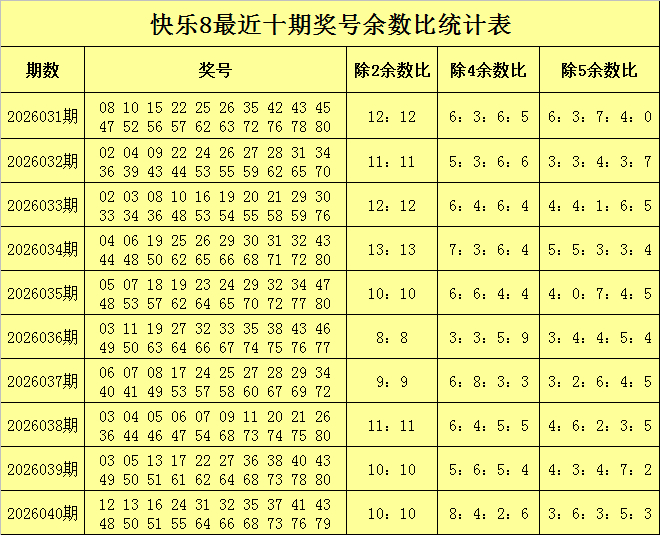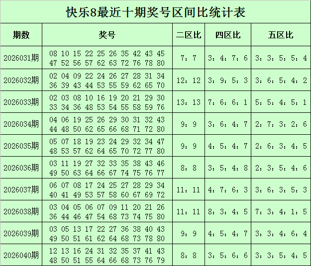 福彩快乐8第2026040期开奖回顾:12 13 16 24 31 32 35 37 41 43 48 50 51 55 64 66 68 73 76 79,其中奖号二区比为12:8,四区比为3:5:6:6,五区比为3:3:5:4:5,除2余数比为10:10,除4余数比为8:4:2:6,除5余数比为3:6:3:5:3。